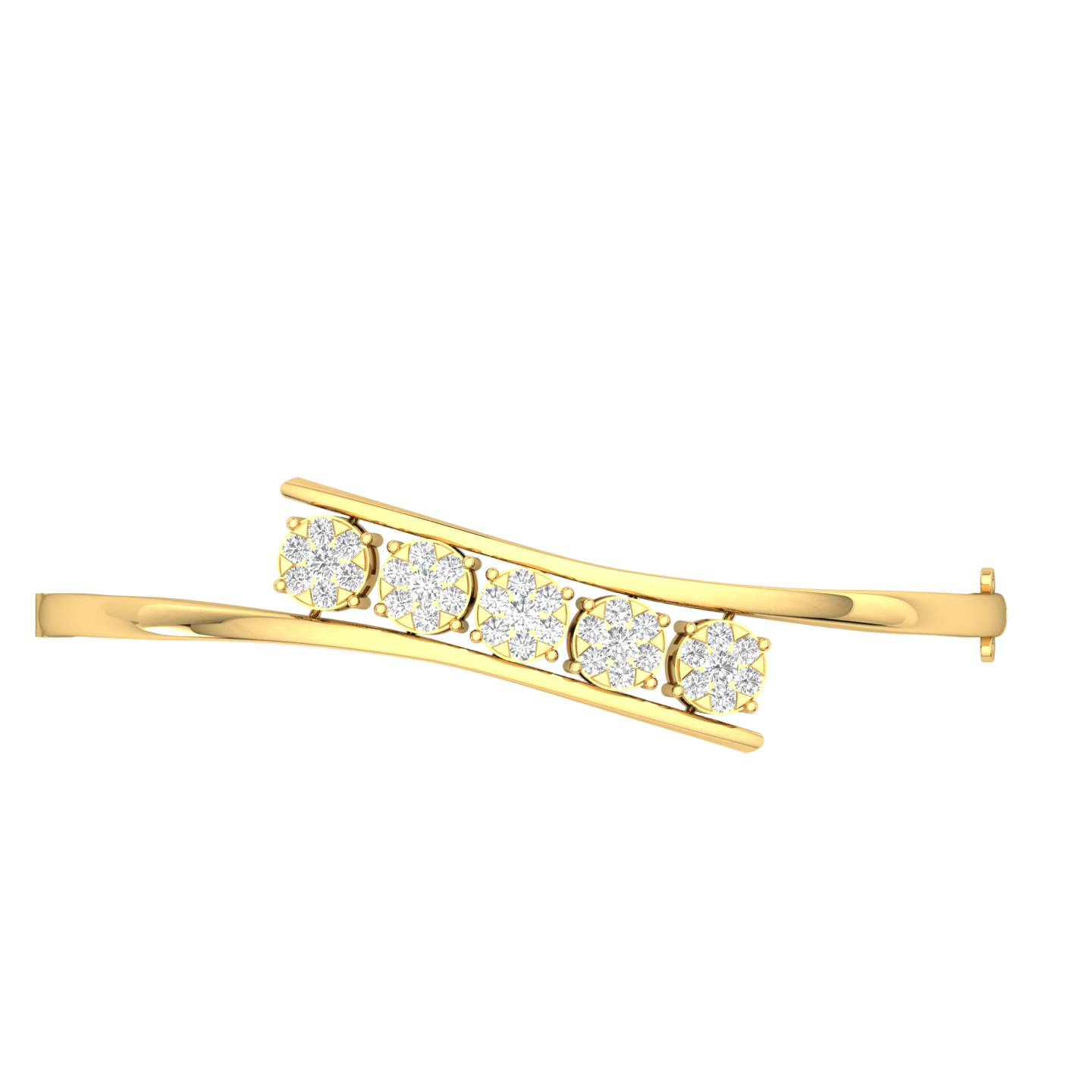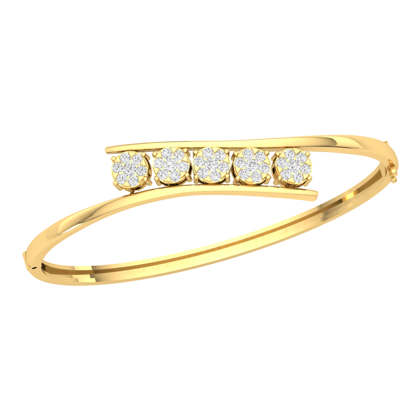 Crafted in luminous Gold (Yellow, White and Rose Gold), the bracelet features a clean, sculptural line that culminates in a dazzling focal point: a horizontal bar showcasing five brilliant lab-grown diamonds. The slightly angled, "bypass" structure gives the piece a dynamic and unique profile, symbolizing endless movement and grace.