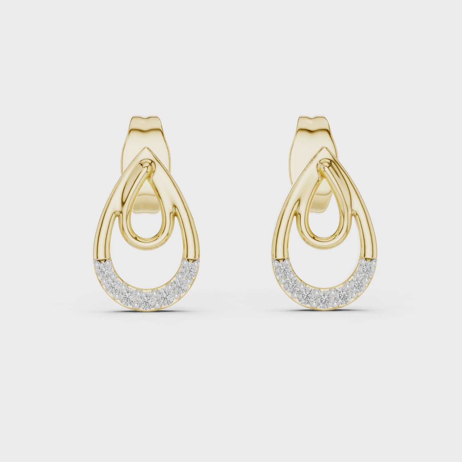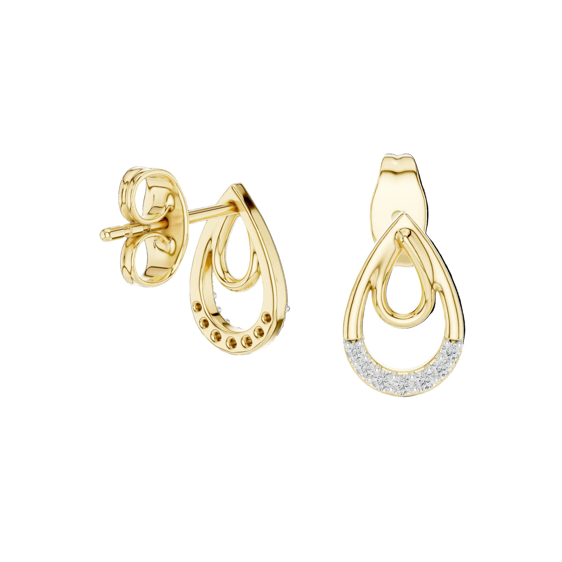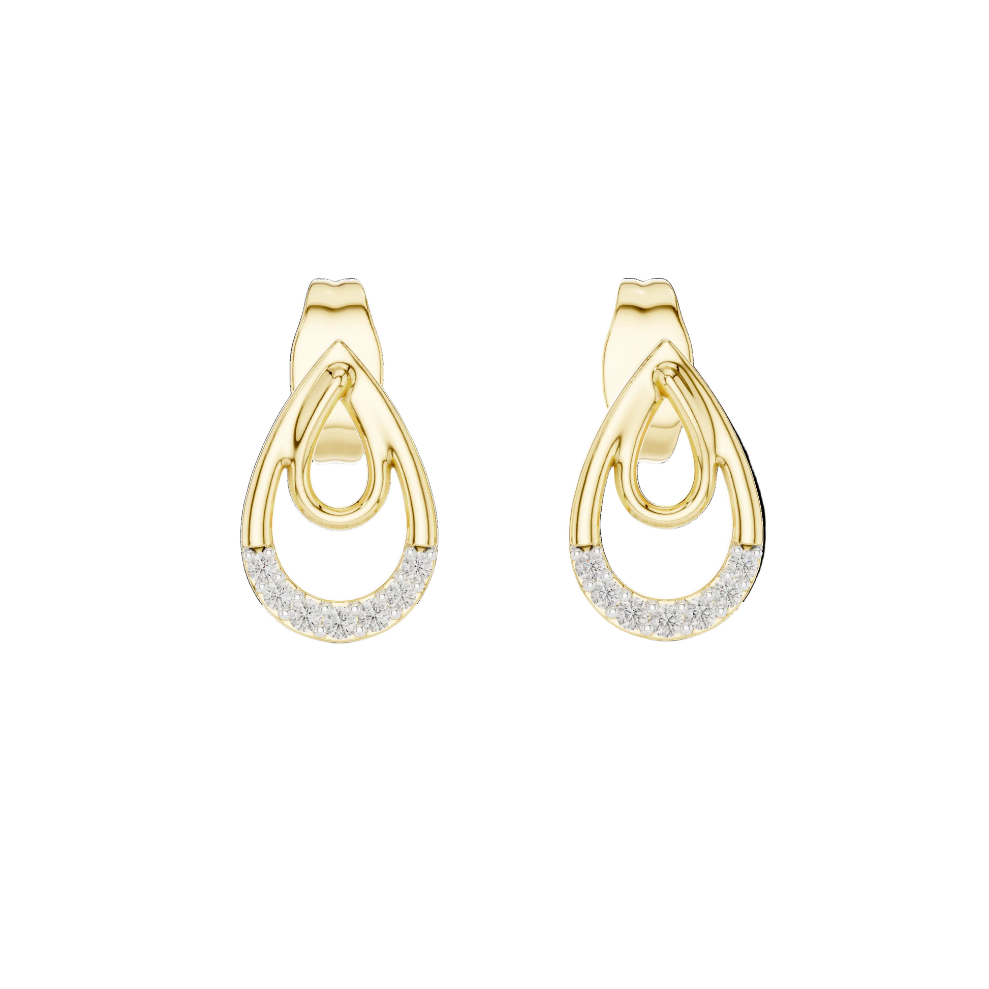 Inspired by the gentle form of a morning dewdrop, the Dewdrop Serenity studs represent a perfect harmony between nature-inspired silhouettes and modern innovation. These earrings feature a sophisticated nested teardrop design, where a polished inner loop of 18K gold is cradled by a diamond-encrusted outer frame, symbolizing protection, continuity, and elegance.